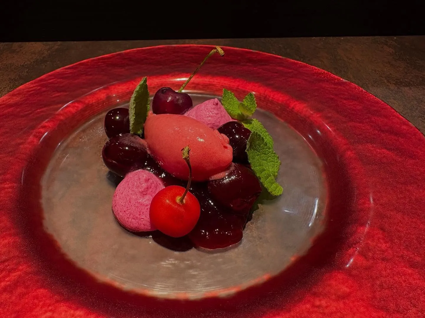 アメリカンチェリーのコンポートとビーツのムース 赤スグリのソルベのコンポジション